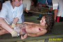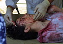 Двор горбольницы. Пацаны - живые. Повезло. В зале была жуткая духота, жара и зловоние. По-этому многие заложники были раздеты. У мальчишки отсутствует рубашка, но надет жилет от "тройки". И даже застегнут на все пуговицы. Невероятно.