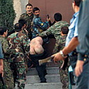 Забор у РОВД. Местные милиционеры взяли в плен еще одного местного. Толпа беснуется, рвется разоврать его в клочья. Их гнев понятен. Но остановили их выстрелами в воздух.